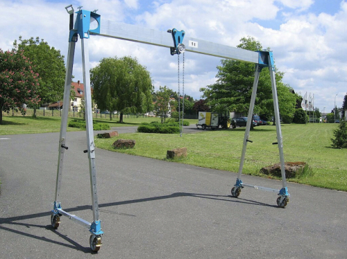 Nosníky a podpěry jeřábu jsou vyrobeny z vysoce kvalitních hliníkových profilů. Díky tomu je konstrukce velmi lehká a mohou ji snadno přenášet dvě osoby. Kloubové spojení mezi nosníkem a podpěrami umožňuje snadné ustavení jeřábu jednou osobou. Čtyři podpěry se vyklopí, zajistí pojistnými kolíky a poté se nastaví na požadovanou výšku. Zde je zvláště užitečná instalační pomůcka dostupná jako příslušenství. Vzdálenost mezi podpěrami je standardně plynule nastavitelná na každé straně pomocí dvou upínacích šroubů. Jednotlivé podpěry jsou výškově a šířkově stavitelné, v jednotlivých polohách jsou zajišťovány čepy. Jestliže jeřáb není používán, je možno ho snadno složit a uskladnit ho.
