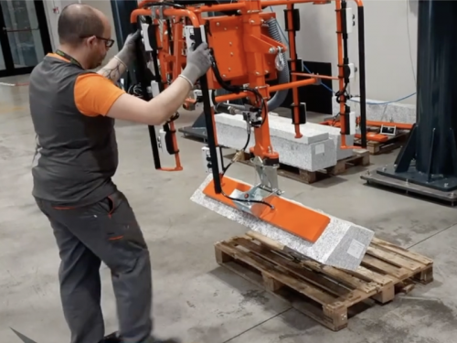 Průmyslové manipuátory, určené pro rychlou, ergonomicnou a bezpečnou manipulaci s těžkým betonenovým, či kamenným blokem.