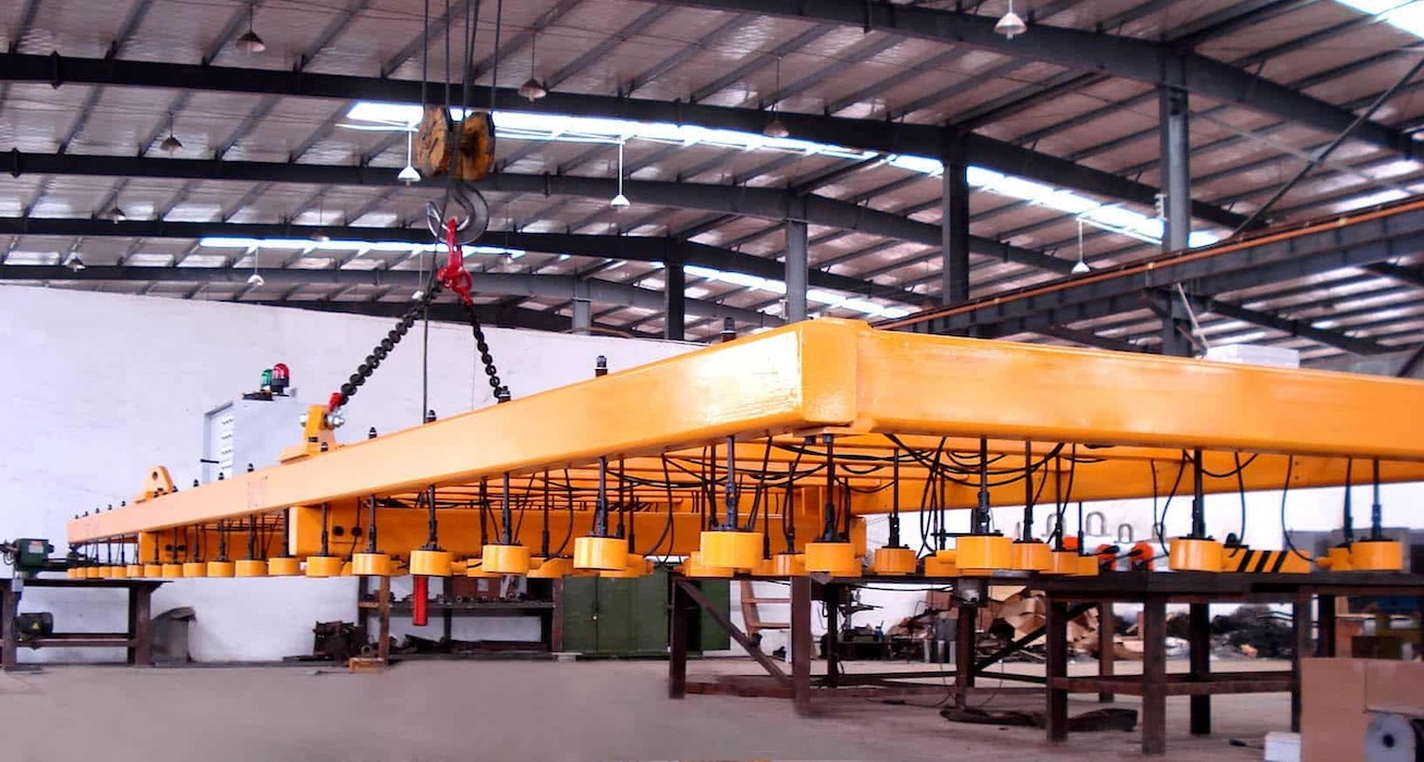 Magnetická traverza typu HM5, určená na nakladanie a vykladanie rezacích strojov, sa používa na efektívne odstraňovanie odrezkov vrátane zvyškového materiálu z rezacieho stroja jedným pohybom.