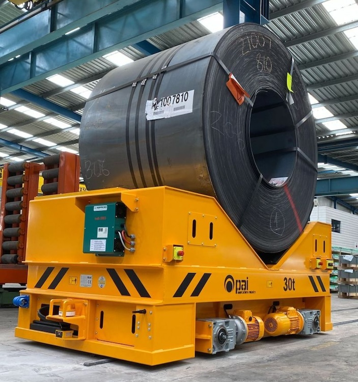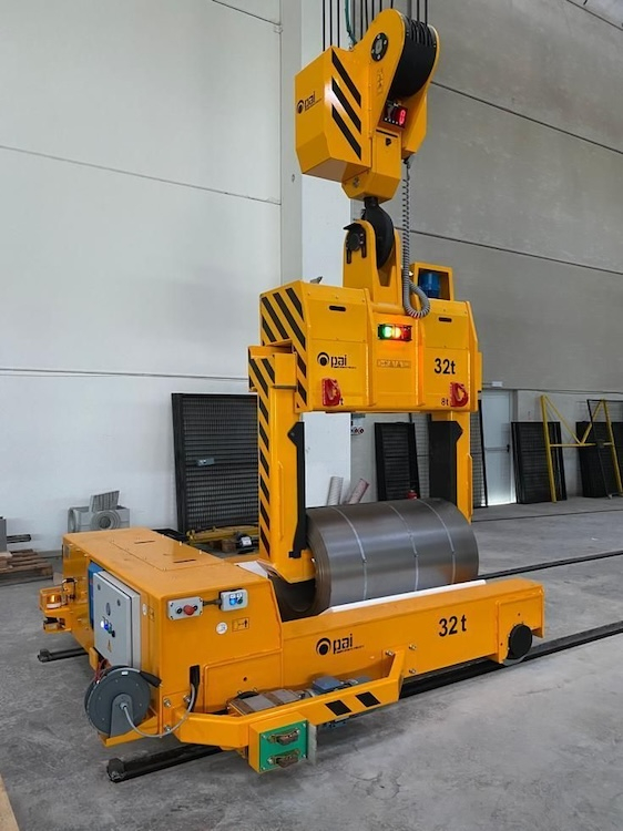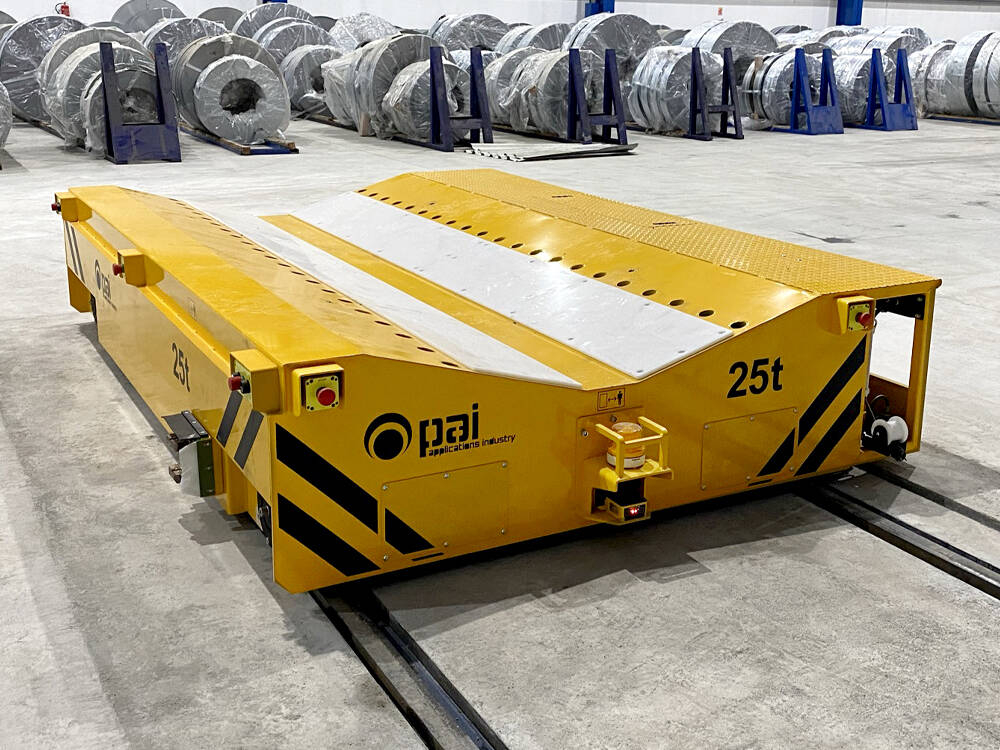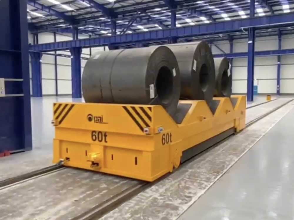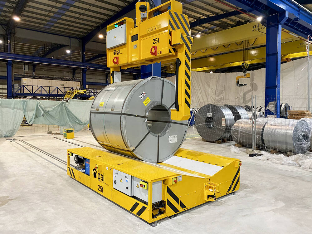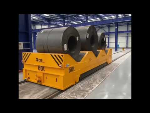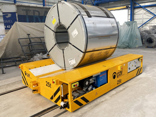 Koľajový manipulačný vozík na prevážanie zvitkov plechov